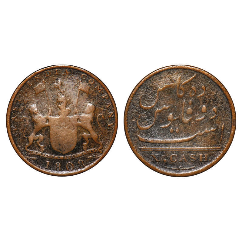 Madras Presidency, Copper X (Ten) Cash, 4.25g (light Issue), Struck at Soho Mint, 1808 AD, Obv: Coat of Arms of Company with date below Plain Edge, Rev: 'Das Kas do Falus Ast' in Persian and Value in English 'X Cash'. P.Stevens (Page 531) 5.135 / F.Prid 206 . Fine+, Very Scarce.