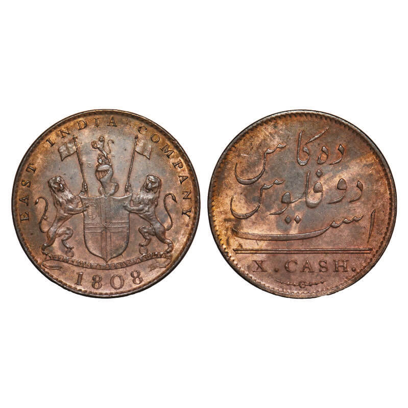 | Madras Presidency, Copper X (Ten) Cash, 4.64g (light Issue), Struck at Soho Mint, 1808 AD, Obv: Coat of Arms of Company with date below Plain Edge, Rev: 'Das Kas do Falus Ast' in Persian and Value in English 'X Cash', difficult to find in this grade. P.Stevens (Page 531) 5.135 / F.Prid 206. Extremely Fine+, Very Scarce. |
