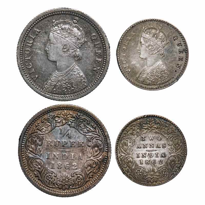 | Victoria Queen, Silver, 1862 (2 coins), 1) 1/4 Rupee, Madras Mint, A/I, 2) 2 Annas, Calcutta Mint, A/I, Bottom flower top 3 petals broader then Left and Right connecting petals. F. Prid 378, 485. GK 379, 381. Very Fine to Very Fine+. Scarce. |