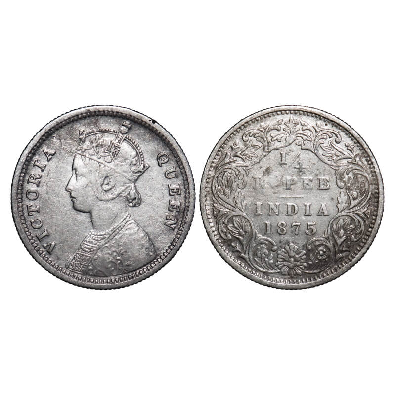 Victoria Queen, Silver, 1/4 Rupee, 1875, Bombay Mint, A/I, No dot. F. Prid 406. GK 666. Very Fine. Very Scarce.