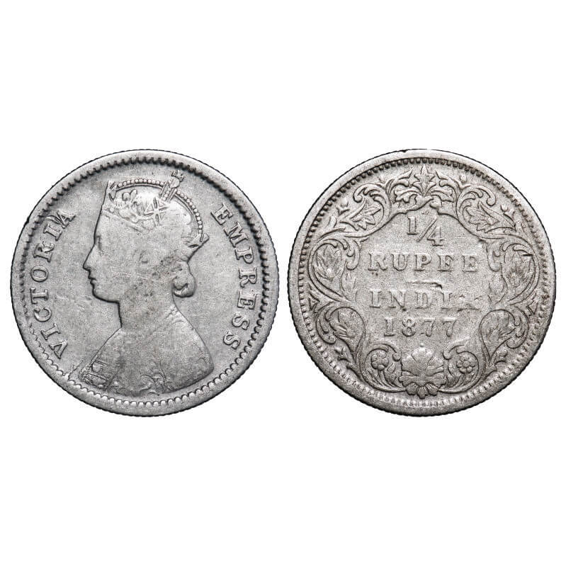 Victoria Empress, Silver, 1/4 Rupee, 1877, Bombay Mint, B/I, Dot. F. Prid 409. GK 671. Fine+. Very Scarce.