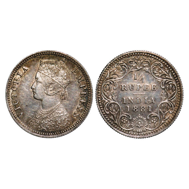 Victoria Empress, Silver, 1/4 Rupee, 1881, Bombay Mint, A/II, Dot. F. Prid 410. GK 676. About Uncirculated. Very Rare.