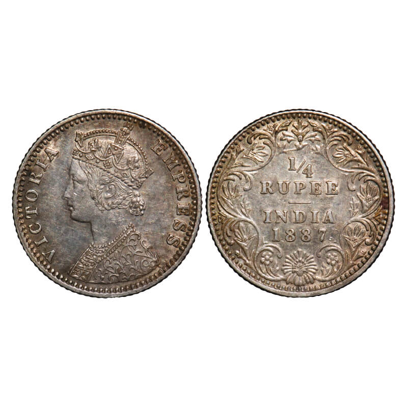 Victoria Empress, Silver, 1/4 Rupee, 1887, Bombay Mint, C(i)/II, 'B' raised. F. Prid 420. GK 708. About Uncirculated. Rare.