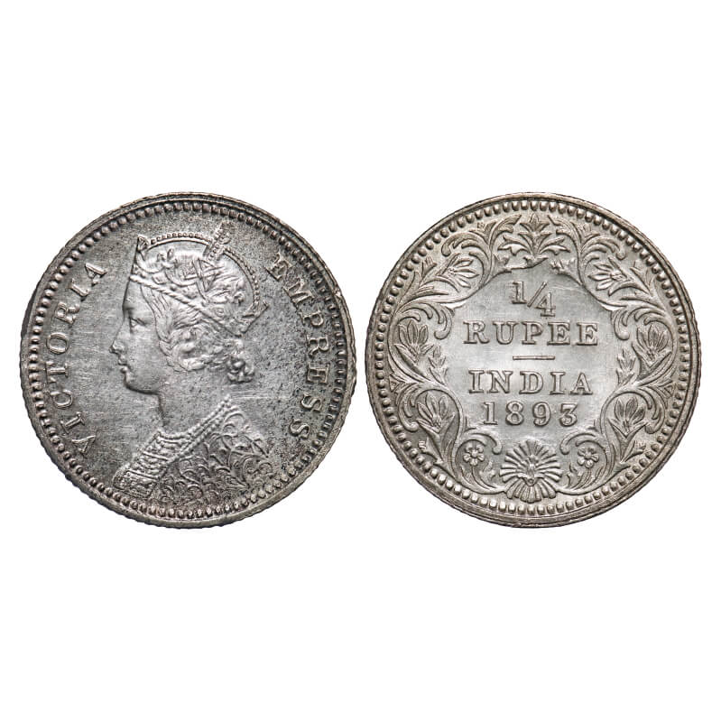 Victoria Empress, Silver, 1/4 Rupee, 1893, Calcutta Mint, C/II, 'C' incused. F. Prid 398. GK 725. Extremely Fine. Very Scarce.