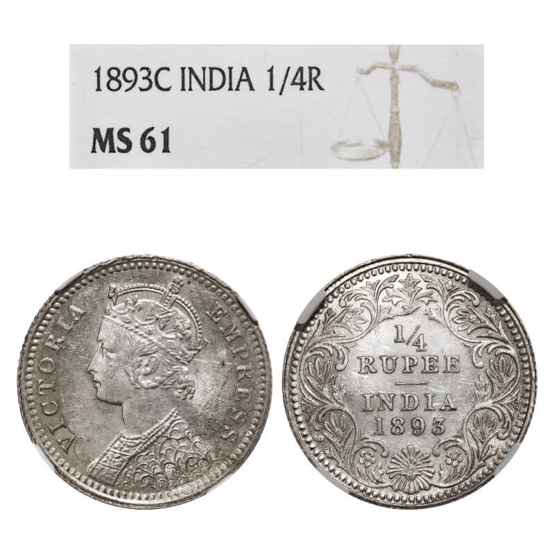 Victoria Empress, Silver, 1/4 Rupee, 1893, Calcutta Mint, C/II, 'C' incused. F. Prid 398. GK 725. NGC Slabbaed MS 61. Rare.