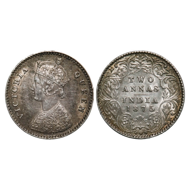 Victoria Queen, Silver, 2 Annas, 1875, Calcutta Mint, A/I, No mint mark, An vertical cross extra metal line runs on the Obv near the ear. F. Prid 489. GK 742. Extremely Fine+. Very Scarce.