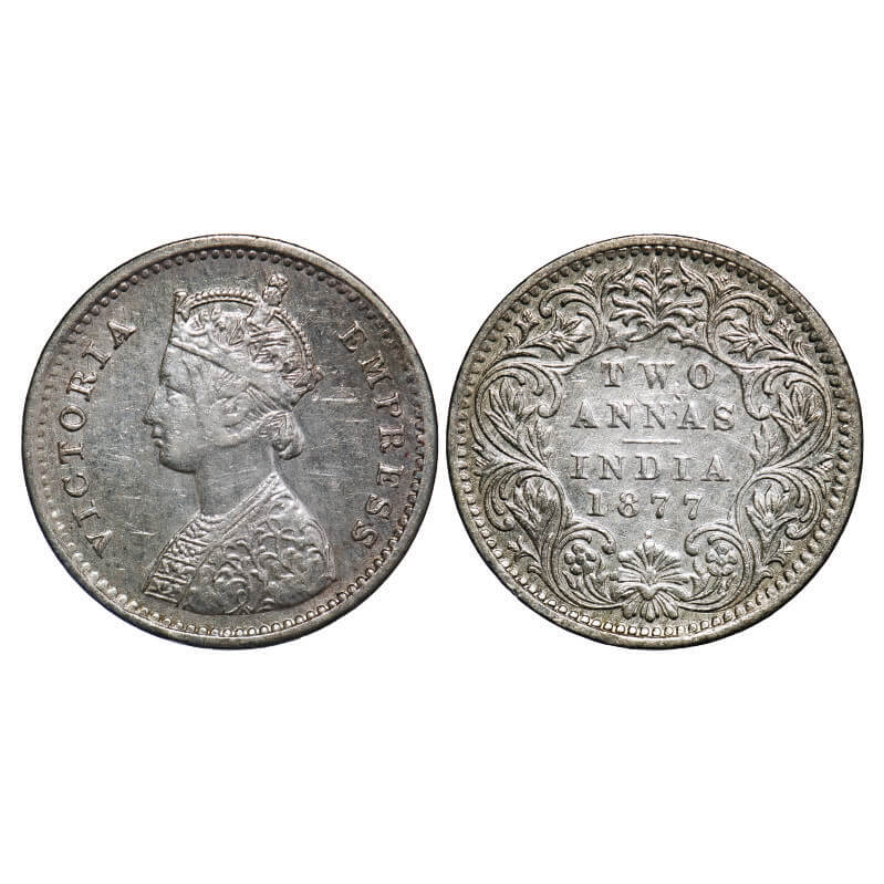 Victoria Empress, Silver, 2 Annas, 1877, Bombay Mint, A/I, Dot. F. Prid 520. GK 746. Very Fine+. Very Scarce.