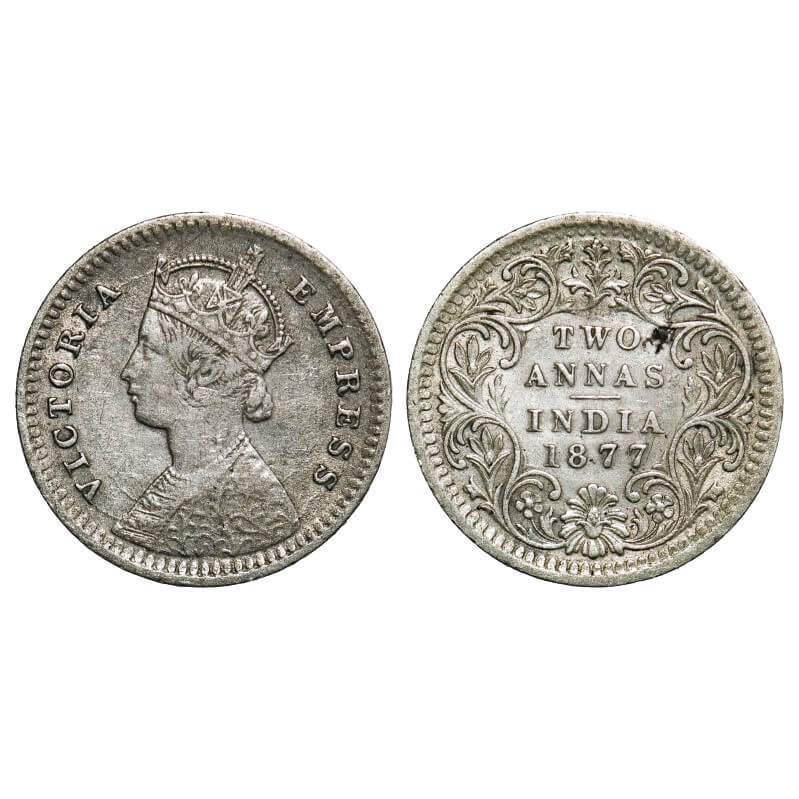 | Victoria Empress, Silver, 2 Annas, 1877, Bombay Mint, B/II, Dot, MULE, Obv Calcutta Rev Bombay, Dot is positioned on the tip of top flower. F. Prid Unlisted. GK 747. Very Fine+. Rare. |