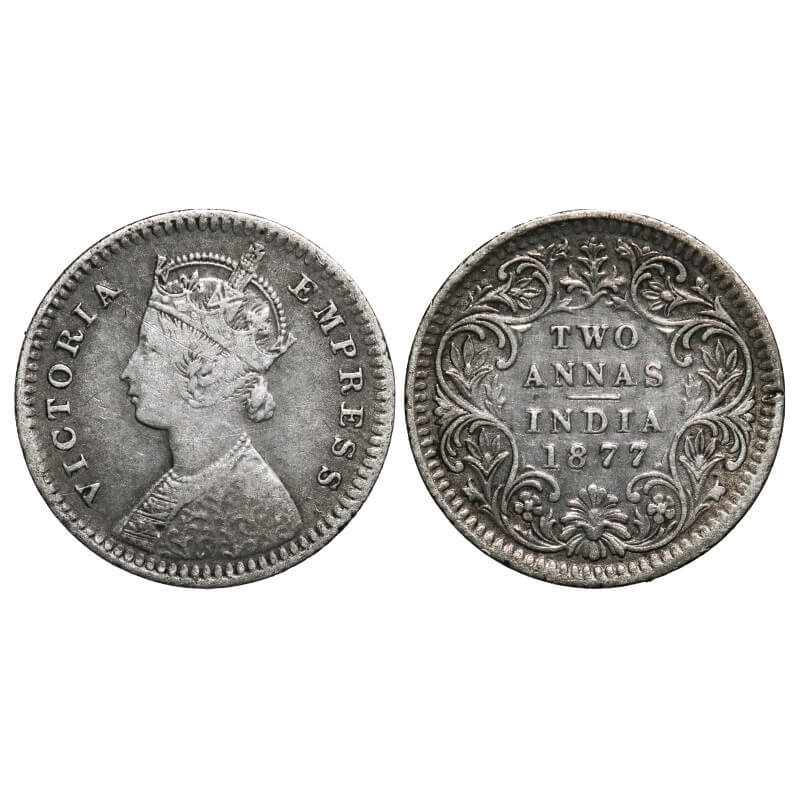 | Victoria Empress, Silver, 2 Annas, 1877, Bombay Mint, B/II, Dot, MULE, Dot is positioned on the tip of top flower Obv Calcutta Rev Bombay. F. Prid Unlisted. GK 747. Very Fine. Rare. |