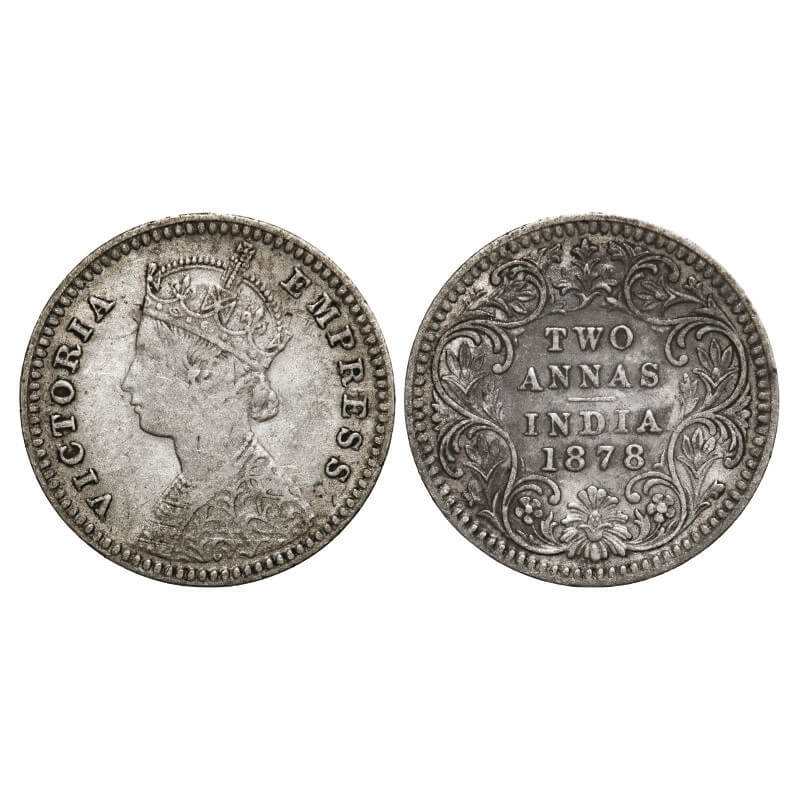 Victoria Empress, Silver, 2 Annas, 1878, Calcutta Mint, B/II, No mint mark. F. Prid 493. GK 751. Very Fine. Scarce.