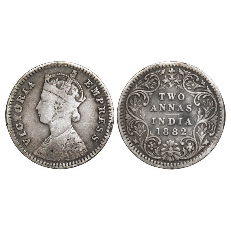 Victoria Empress, Silver, 2 Annas, 1882, Calcutta Mint, B/II, 'C' incused. F. Prid 497. GK 763. Fine+. Scarce.