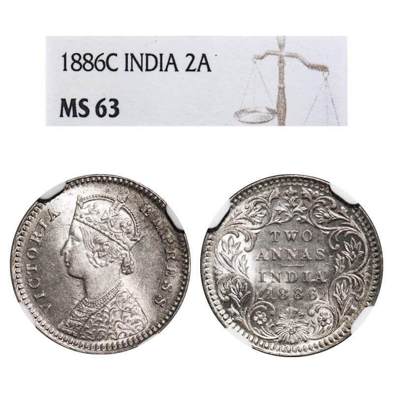Victoria Empress, Silver, 2 Annas, 1886, Calcutta Mint, B/II, 'C' incused. F. Prid 501. GK 782. NGC Slabbed MS 63. Very Rare.