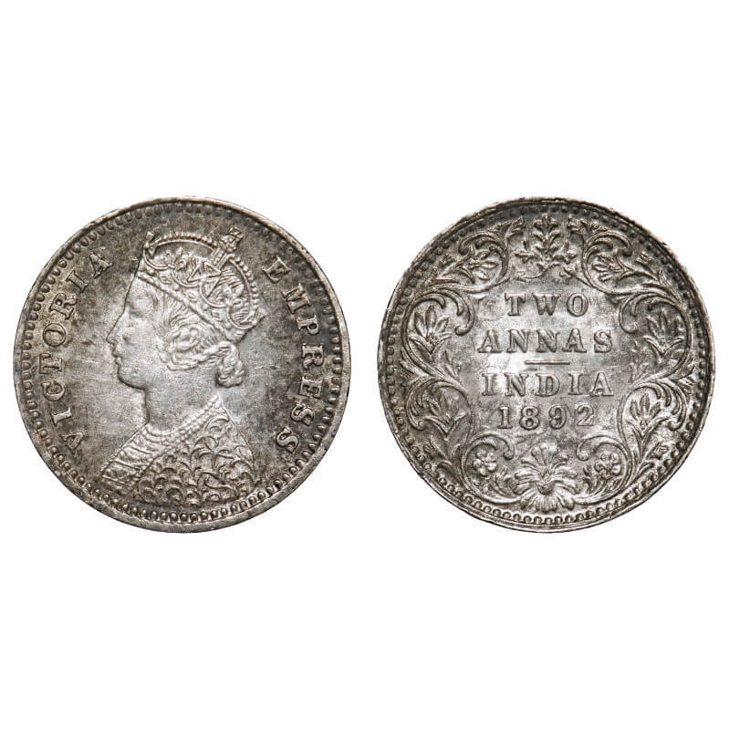 Victoria Empress, Silver, 2 Annas, 1892, Bombay Mint, B/II, 'B' incused. F. Prid 547. GK 796. About Uncirculated. Very Scarce.