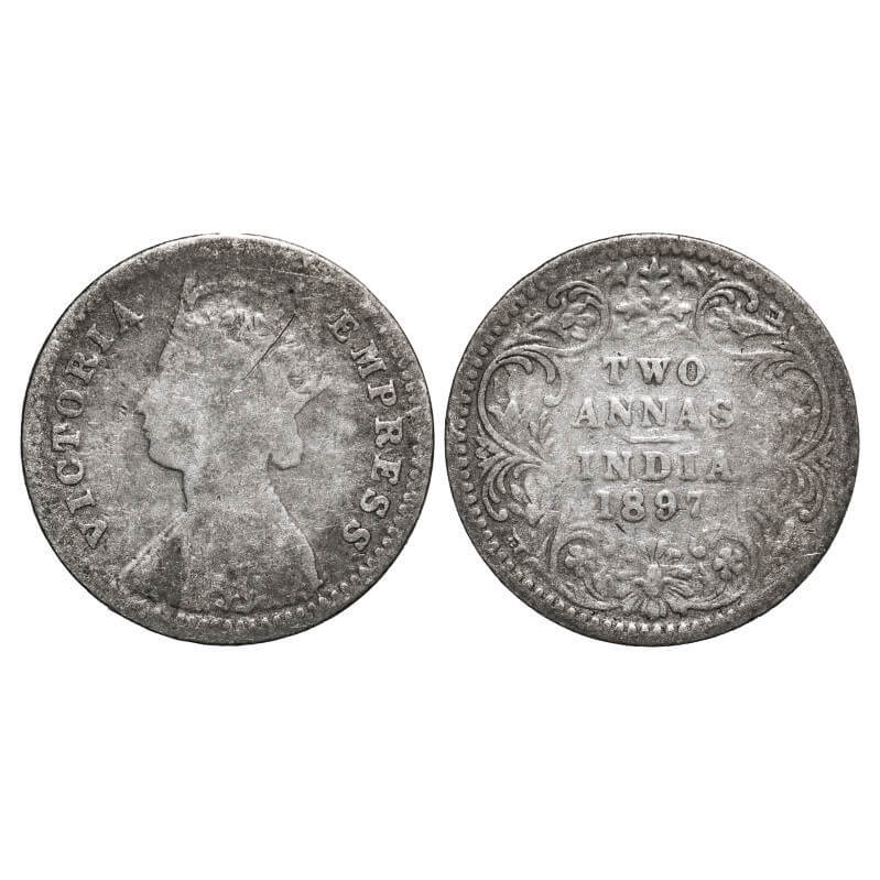 Victoria Empress, Silver, 2 Annas, 1897, Bombay Mint, B/II, 'B' incused. F. Prid 551. GK 806. Fine+. Scarce.