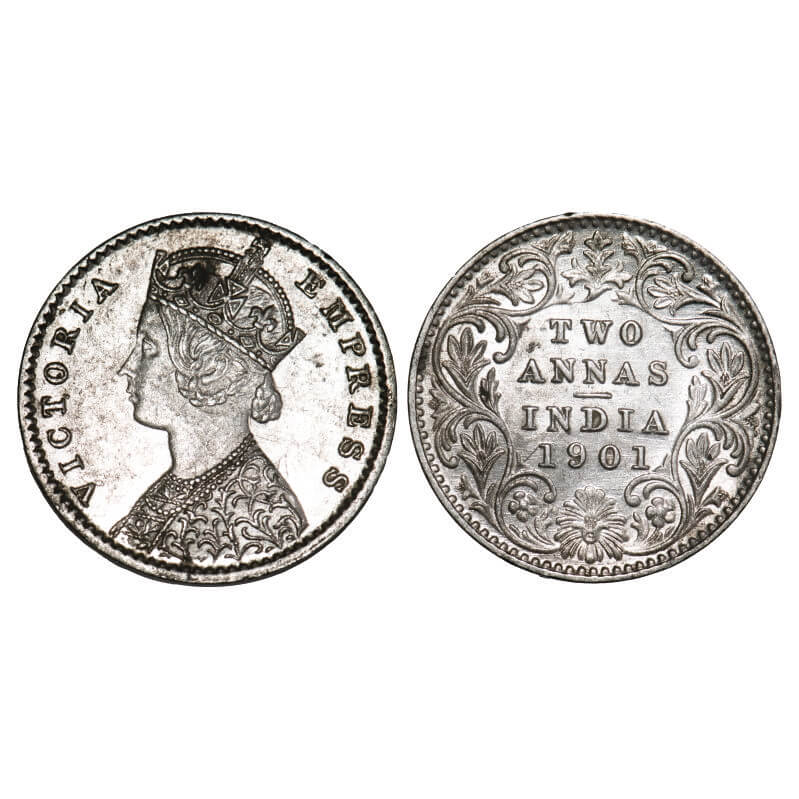 Victoria Empress, Silver, 2 Annas, 1901, Calcutta Mint, B/II, 'C' incused. F. Prid 515. GK 817. Unc...