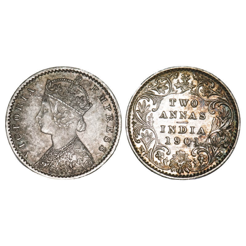 | Victoria Empress, Silver, 2 Annas, 1901, Calcutta Mint, B/II, 'C' incused. F. Prid 515. GK 817. Uncirculated, Details, Toned. Very Scarce. |