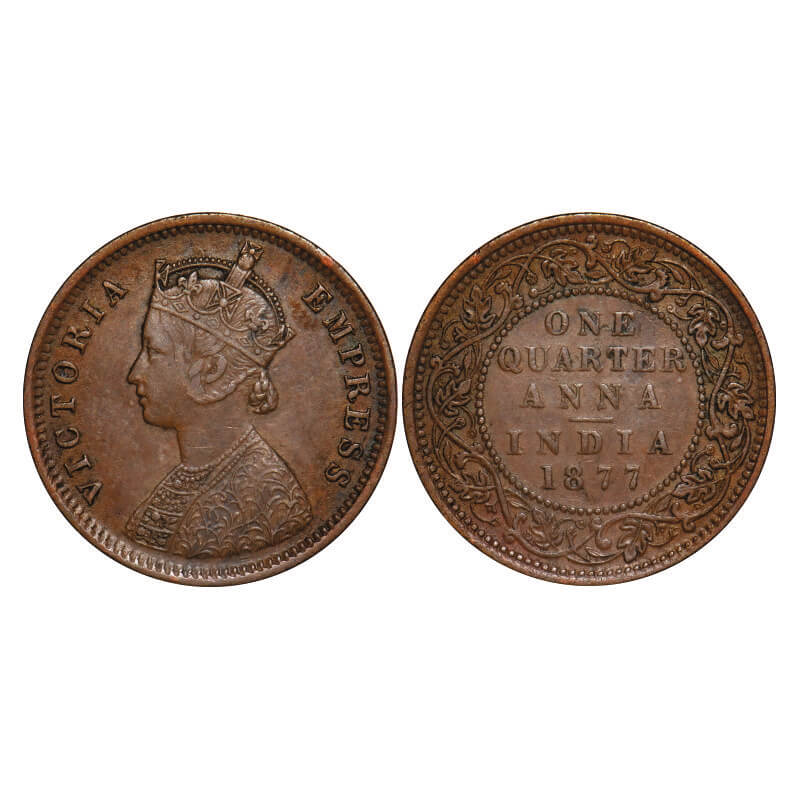 Victoria Empress, Copper, Quarter Anna, 1877, Bombay Mint, B/I, No mint mark. F. Prid 637. GK 828. Very Fine+. Scarce.
