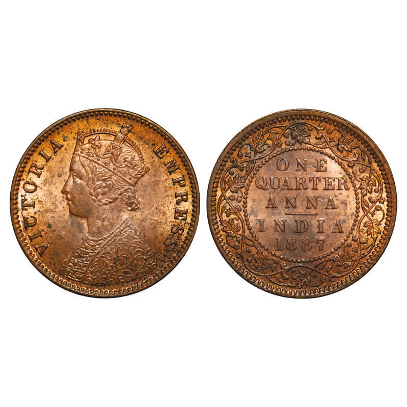 Victoria Empress, Copper, Quarter Anna, 1887, Calcutta Mint, B/II, 'C' incused. F. Prid 620. GK 844. Uncirculated. Very Scarce.