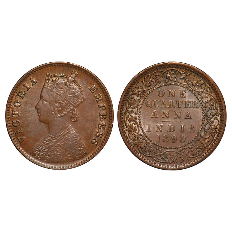 Victoria Empress, Copper, Quarter Anna, 1890, Calcutta Mint, B/II, No mint mark. F. Prid 623. GK 849. Extremely Fine. Very Scarce.