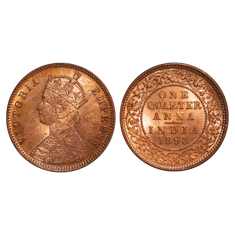 Victoria Empress, Copper, Quarter Anna, 1893, Calcutta Mint, B/II, No mint mark. F. Prid 626. GK 852. Brilliant Uncirculated. Very Scarce.