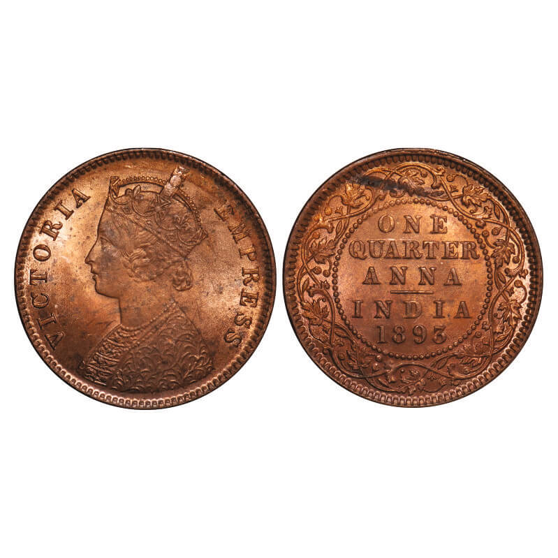 Victoria Empress, Copper, Quarter Anna, 1893, Calcutta Mint, B/II, No mint mark, Die cracks on Obv. F. Prid 626. GK 852. Brilliant Uncirculated. Very Scarce.