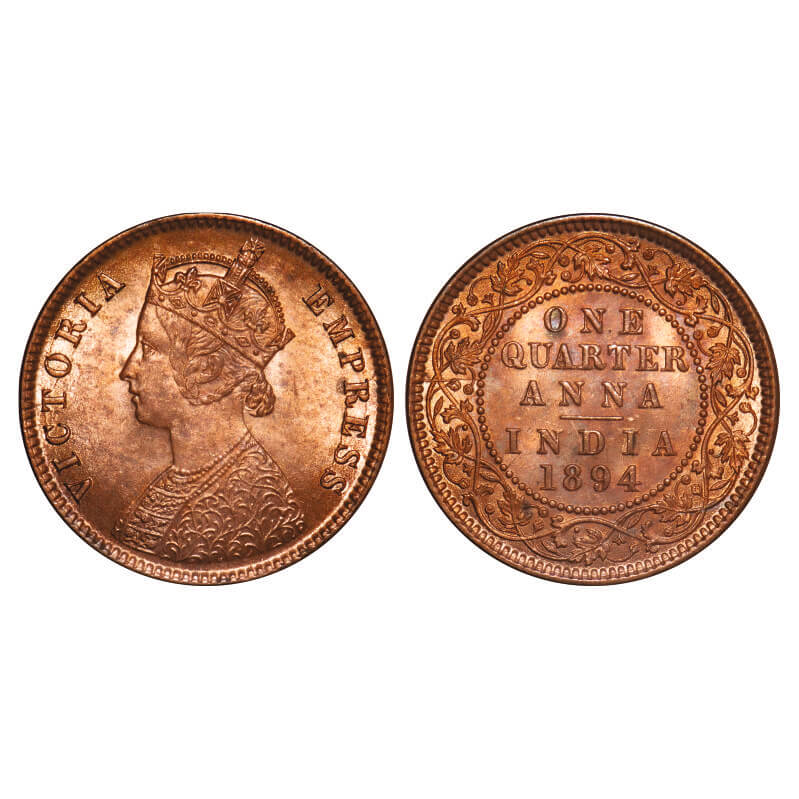 Victoria Empress, Copper, Quarter Anna, 1894, Calcutta Mint, B/II, No mint mark. F. Prid 627. GK 853. Uncirculated. Very Scarce.
