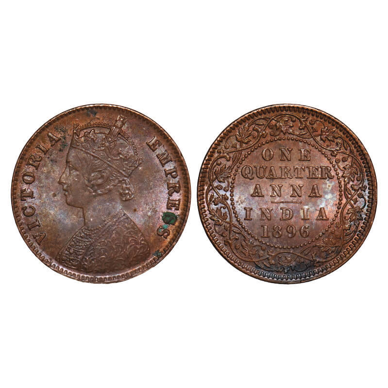 Victoria empress, Copper, Quarter Anna, 1896, Calcutta Mint, B/II, No mint mark, Die cracks on Obv. F. Prid 629. GK 855. Brilliant Uncirculated. Very Scarce.