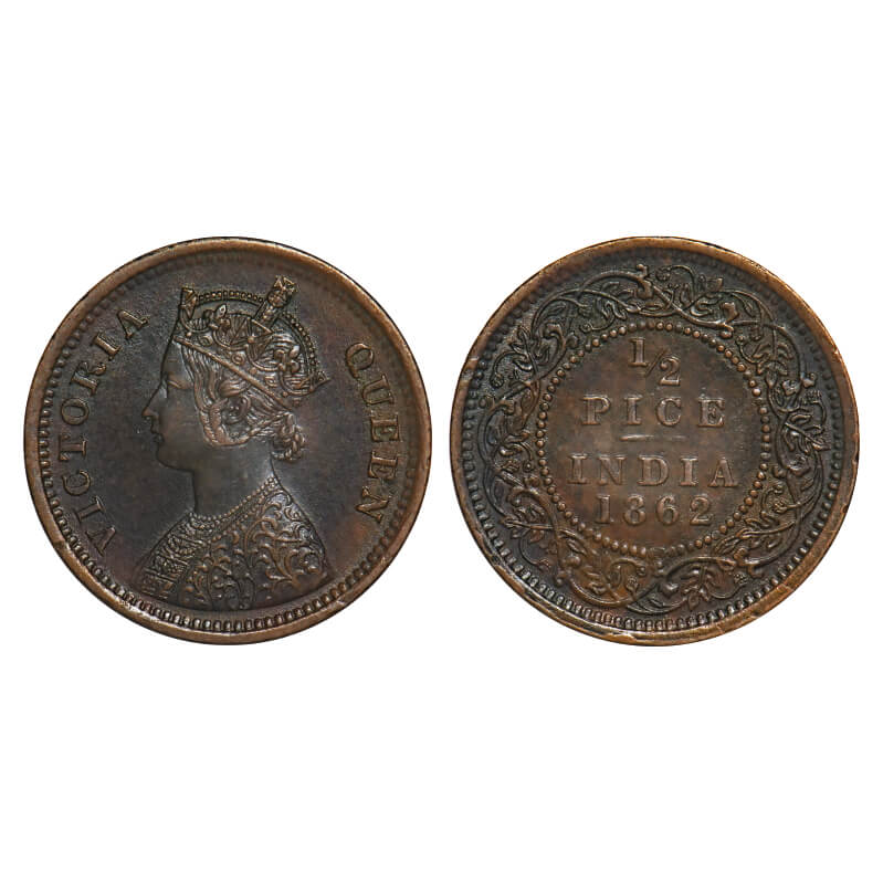 Victoria Queen, Copper, 1/2 Pice, 1862, Calcutta Mint, A/I. F. Prid 710. GK 401. Extremely Fine+. Scarce.