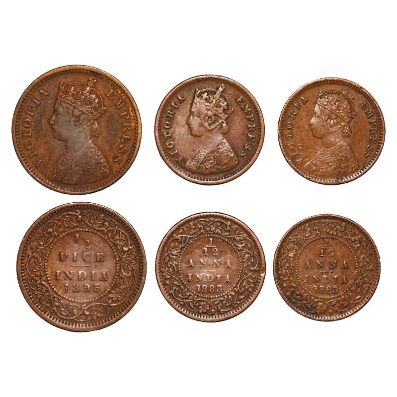 | Victoria Empress, Copper, 1/2 Pice & 1/12 Anna(2), (3 coins), 1) 1895, Calcutta mint, A/I, No mint mark, 2) 1883, Bombay Mint, Obv A, No mint mark, 3) 1883, Calcutta Mint, Obv B, No mint mark. F. Prid 728, 811, 789. GK 875, 895, 897. Very Fine. Scarce. |