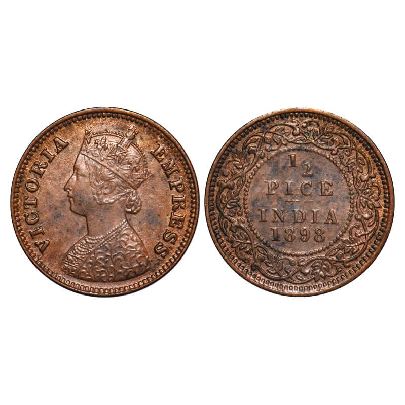 Victoria empress, Copper, 1/2 Pice, 1898, calcutta Mint, A/I, No mint mark, w/o cross bar between 1 and 2 of 1/2. F. Prid 731. GK 878. Extremely Fine+. Very Scarce.
