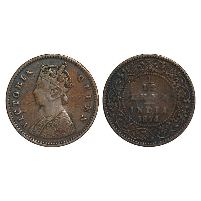 Victoria Queen, Copper, 1/12 Anna, 1874, Calcutta Mint, Obv A, No mint mark. F. Prid 783. GK 882. Fine+. Very Scarce.