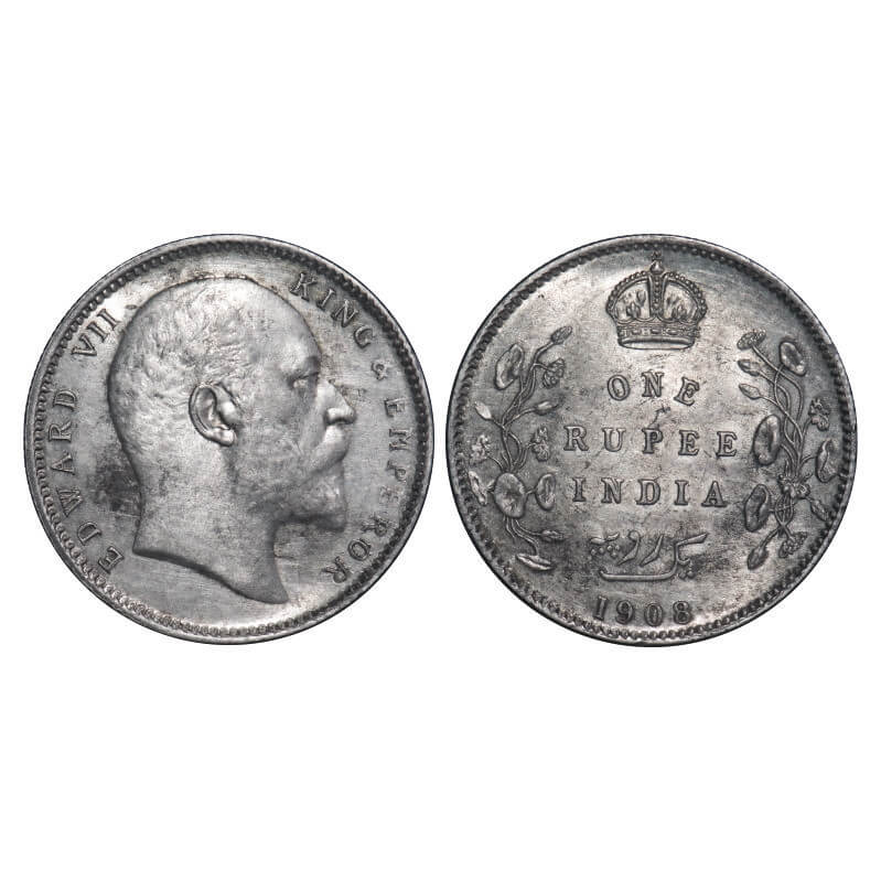 Edward VII, Silver, Rupee, 1908, Calcutta Mint, No mint mark, Ghost on Rev, Mechanical die doubling of alphabates on Obv. F. Prid 194. GK 946. Extremely Fine+. Very Scarce.