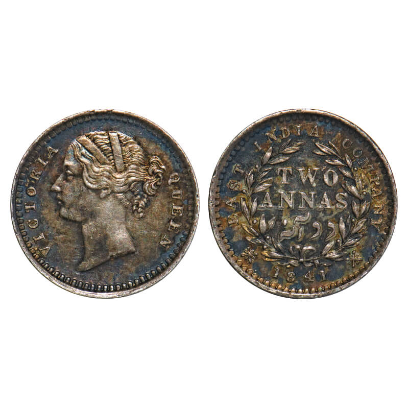 | Victoria Queen, Silver, 2 Annas, 1841, DL, Bombay Mint, .W.W raised, Wreath with 9 Berries (5L + 4R). F. Prid Unlisted. GK 225. About Uncirculated, Toned. Very Scarce. |