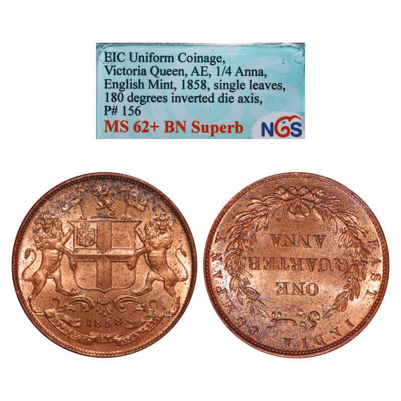 | Victoria Queen, Copper, Quarter Anna, 1858, J. Watt & Co., Birmingham Mint, Single leaf, Year numerals closer to the above Five line design, Rev inverted. F. Prid. 156. GK 231. NGS Slabbed MS 62+ BN Superb. Rare. |
