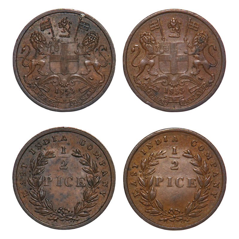 Victoria Queen, Copper, 1/2 Pice, (2 coins), 1853, Calcutta Mint, B/I, Wreath with 19 Berries (10L + 9R). F. Prid 159(2). GK 235(2). Very Fine to Very Fine+. Scarce.