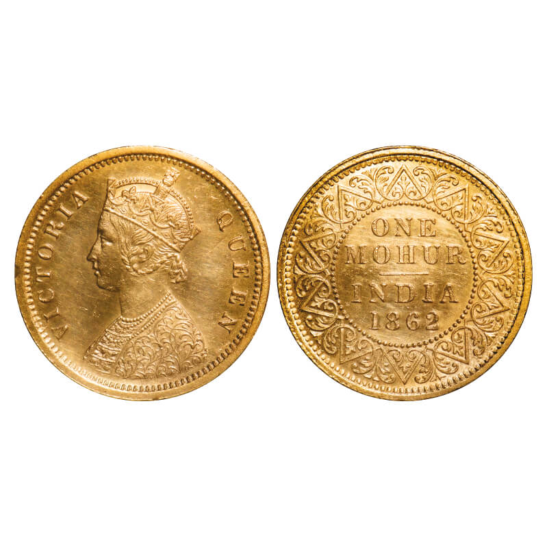 | Victoria Queen, Gold, Mohur, 1862, Calcutta Mint, Two flowers in bottom panel of jabot, A tiny 'V' in relief. F. Prid. 6. Uncirculated. Very Rare. |