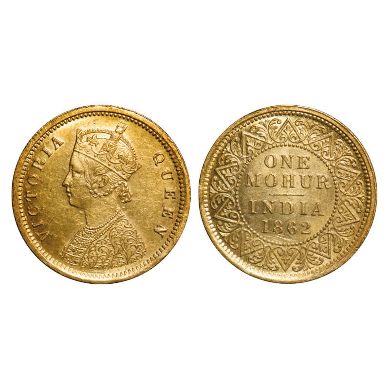 | Victoria Queen, Gold, Mohur, 1862, Calcutta Mint, Two flowers in bottom panel of jabot, A tiny 'V' in relief. F. Prid. 6. Extremely Fine+. Rare. |