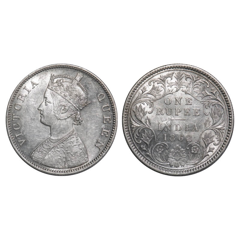 | Victoria Queen, Silver, Rupee, 1862, Calcutta Mint, B/III, Embroidery in high relief, Ghost on Rev, Flat 1. F. Prid 60. GK 243. Extremely Fine+. Very Scarce. |