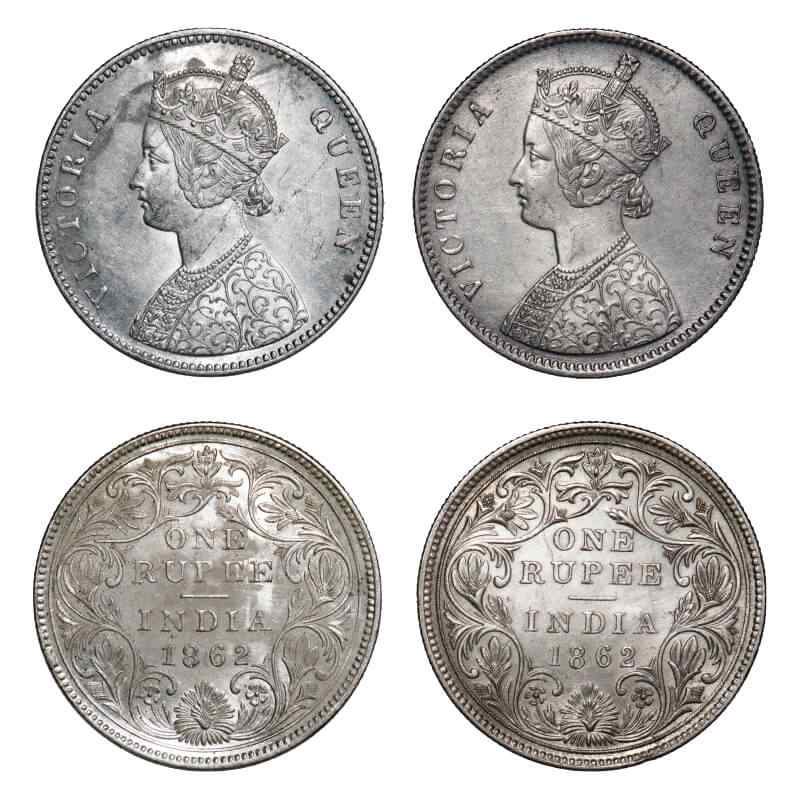 | Victoria Queen, Silver, Rupee, 1862, (2 coins), Calcutta Mint, inclined 1, 1) A/II(i), With initial 'J', With Pineapple like buds at 4 different places, 3 Pineapple buds above 'O' & 'E' of One, One Pineapple bud above second 'E' of Rupee, 2) A/II(iii), w/o initial 'J', With Pineapple like buds at 3 different places, 2 Pineapple buds above 'O' & 'N' of One, 1 Pineapple bud above second 'E' of Rupee. F. Prid 62, 63. GK 244, 247. Extremely Fine+. Very Scarce. |