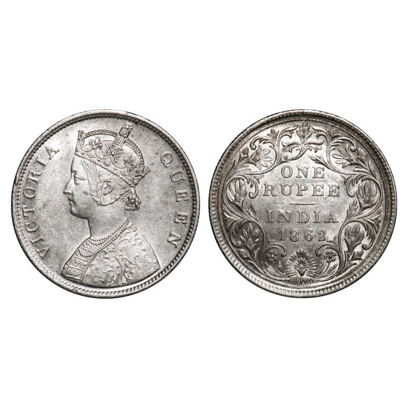 | Victoria Queen, Silver, Rupee, 1862, Calcutta Mint, A/II(v), w/o initial 'J', With Pineapple like bud at one place only above 'O' of One, Inclined 1. F. Prid Unlisted. GK 248. Extremely Fine+. Very Scarce. |