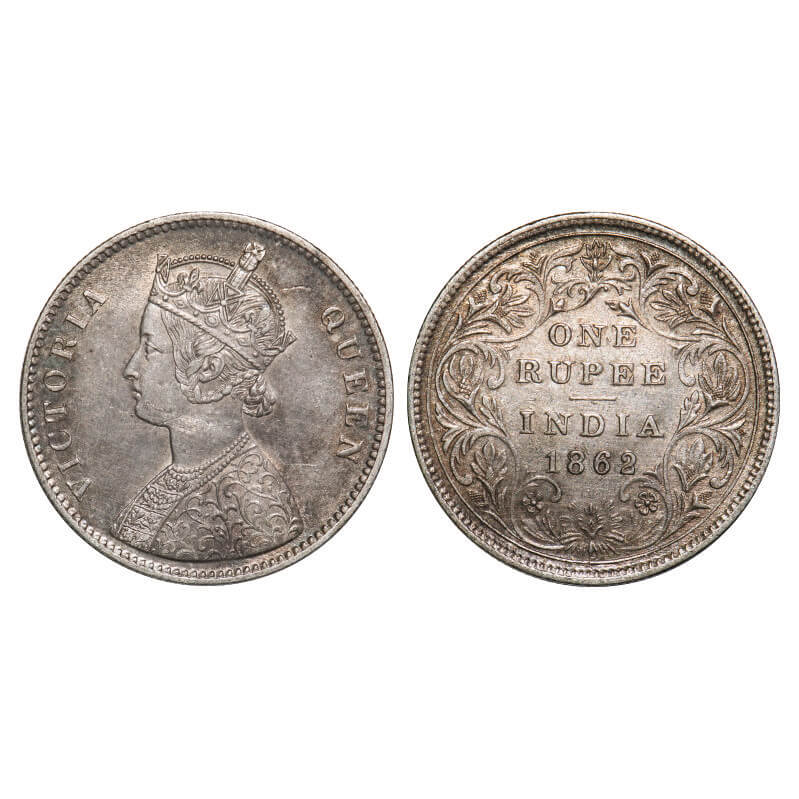 Victoria Queen, Silver, Rupee, 1862, Calcutta Mint, A/II, w/o initial 'J', some parts in bottom flower are die filled, Inclined 1. F. Prid 64. GK 252. About Uncirculated. Scarce.