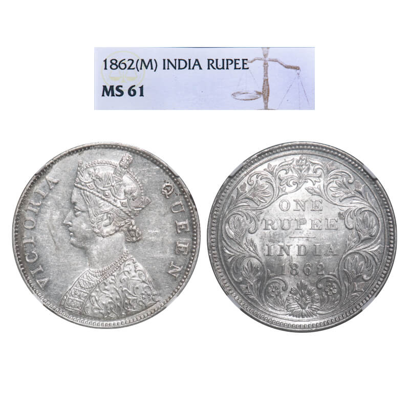 Victoria Queen, Silver, Rupee, 1862, Madras Mint, B/II, w/o enclosed frame effect and with Re-engraving in hairs, Inclined 1. F. Prid Unlisted. GK 265. NGC Slabbed MS 61. Rare.