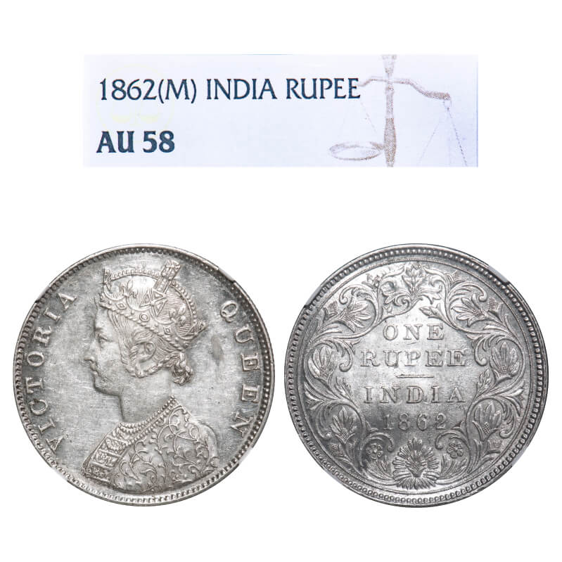 Victoria Queen, Silver, Rupee, 1862, Madras Mint, B1/II, w/o enclosed frame effect, Inclined 1. F. Prid Unlisted. GK 270. NGC Slabbed AU 58. Rare.