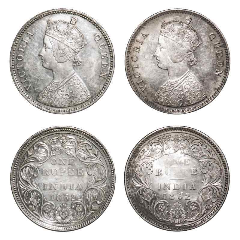 | Victoria Queen, Silver, Rupee, 1862, (2 coins), Bombay Mint, 1) A/I/0/4, w/o initial 'J', 2) A/II/0/7, w/o initial 'J', Mechanical die doubling in numerals of year date 1862. F. Prid 78, 87. GK 305, 329. Extremely Fine+ to About Uncirculated. Very Scarce. |