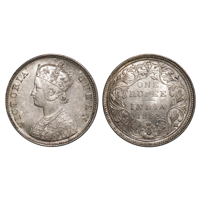| Victoria Queen, Silver, Rupee, 1862, Bombay Mint, B/II/0/4, Inclined 1, 4 dots placed are in straight horizontal line, Ghost on Rev. F. Prid 81. GK 310. About Uncirculated. Very Scarce. |