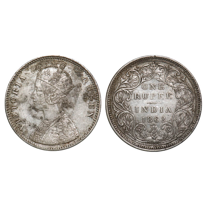 | Victoria Queen, Silver, Rupee, 1862, Bombay Mint, A/II/2/5, Re used of earlier Rev dies without erasing top 2 dots, w/o initial 'J', (Very Rare to get this type dot variety), Inclined 1. F. Prid Unlisted. GK 314. Very Fine+, Details. Rare. |