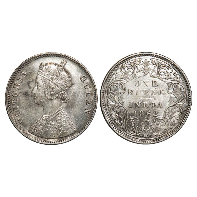 | Victoria Queen, Silver, Rupee, 1862, Bombay Mint, A/I/0/5, 4th micro dot is between 3rd and 5th dot (attached over 5th dot), (Very Rare variety in Rev I coins of 1862 year date series), Flat 1. F. Prid Unlisted. GK 315. Extremely Fine+. Very Rare. |