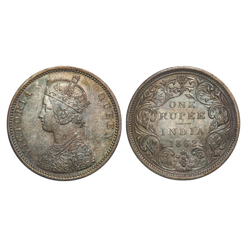 | Victoria Queen, Silver, Rupee, 1862, Bombay Mint, A/II/0/7, With initial 'J', Inclined 1. F. Prid 87. GK 327. Almost Uncirculated, Toned. Very Scarce. |