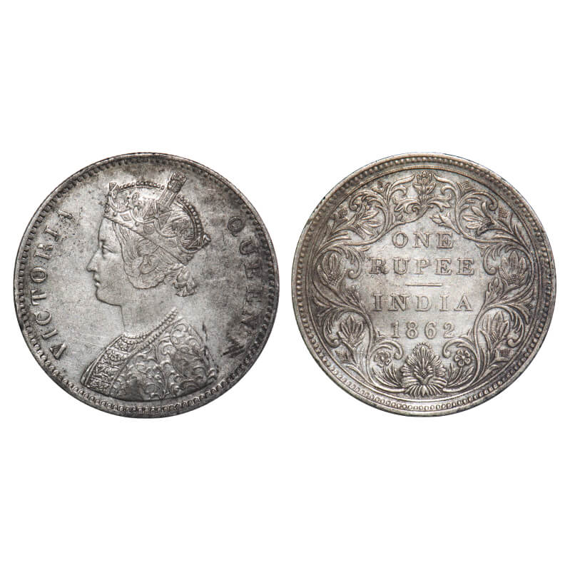 | Victoria Queen, Silver, Rupee, 1862, Bombay Mint, A/II/1/10, w/o initial 'J', Dot placed within the tip of top flower, Inclined 1. F. Prid 96 . GK 343. Extremely Fine. Rare. (Rare variety in the dot series) |