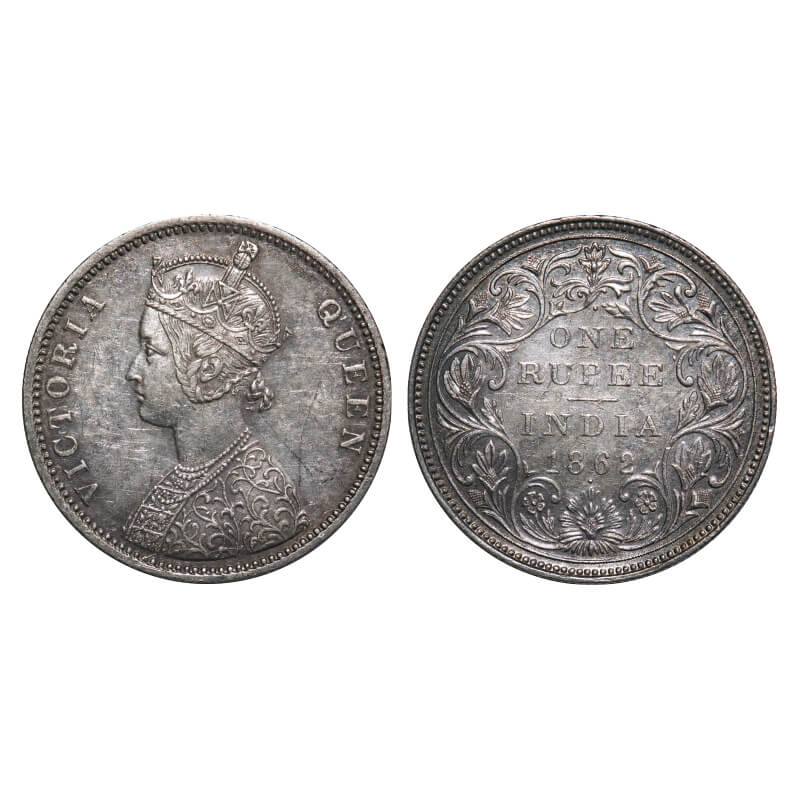 | Victoria Queen, Silver, Rupee, 1862, Bombay Mint, A/II/1/1, With initial 'J', Die crack on Obv, Inclined 1. F. Prid 99. GK 349. Extremely Fine+. Very Scarce. |